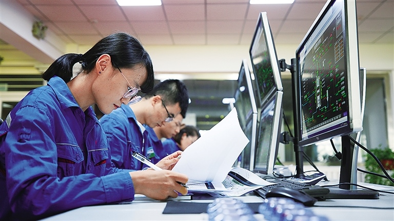 企業(yè)中控室內(nèi),技術(shù)人員正在對設(shè)備運行情況進行監(jiān)控。趙小麗攝