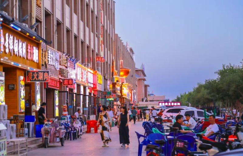 走進(jìn)達(dá)來呼布鎮(zhèn)各主要街道,濃濃的煙火氣撲面而來。不少餐廳門口支起熱鬧的夜市攤位,游客們圍坐在一起,品嘗駝肉、羊肉等當(dāng)?shù)靥厣朗?,歡聲笑語不斷。