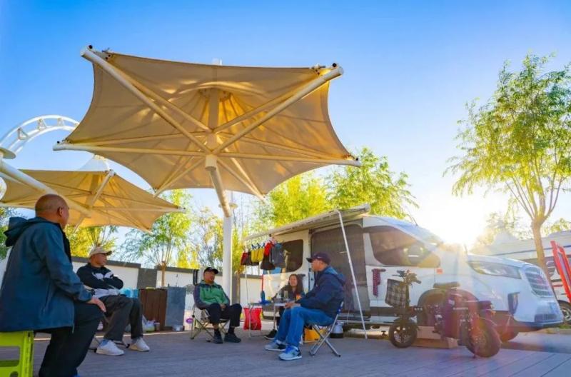 在額濟(jì)納旗居延驛站,不少自駕游旅客搭起帳篷、支起飯桌,三五好友圍坐在一起,盡情探索“露營+”新玩法。旅游旺季期間,居延驛站全力保障車位供給,配備完善的水電系統(tǒng),著力提升游客體驗(yàn)感?!斑@里不僅風(fēng)光獨(dú)特,而且旅游設(shè)施完善、服務(wù)周到,真是不虛此行?!眮碜陨虾5摹澳β冒l(fā)燒友”云楓連連稱贊。