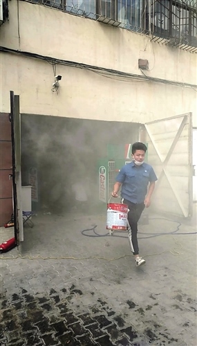 “我家車庫著火了,能不能用熱力站的水幫我滅火?”張霖和徐小煒剛跑出大門口,就碰到了慌慌張張的居民。兩人立刻將皮管從窗戶伸到外面,對(duì)著車庫噴水。由于不清楚用戶車庫內(nèi)有什么易燃物品,發(fā)現(xiàn)火勢(shì)雖被控制但并沒有完全熄滅,兩人又取上站內(nèi)常備的滅火器,一邊熟練地使用一邊分析火情,并戴上防塵面罩在確保安全的情況下進(jìn)入車庫內(nèi),第一時(shí)間撲滅了火源。