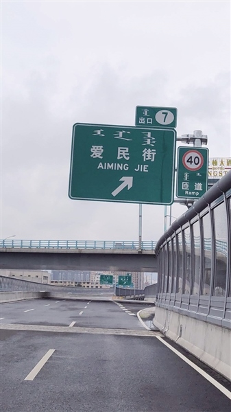 當(dāng)日,記者駕車來到哲里木路高架橋,沿南向北方向行駛,看到沿路提示愛民街下行匝道口的路牌一共有4塊,每塊上都有中文和拼音,顯示為“愛民街”“AIMING JIE”。記者從愛民街下行匝道口到達(dá)愛民街與哲里木路輔路交會處,在東西方向的愛民街路口發(fā)現(xiàn)路牌名是由中文、蒙古文和拼音組成,其中拼音為“AIMIN JIE”。因呼市地區(qū)方言中,“MING”與“MIN”的發(fā)音不易分辨,這也是為什么網(wǎng)友在視頻中說用方言命名路名的原因。