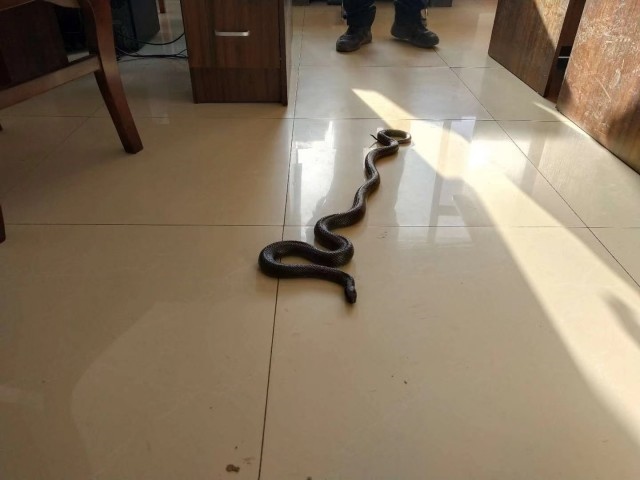 接到報(bào)警后,呼和浩特市玉泉區(qū)公安分局民警立即趕到現(xiàn)場(chǎng),此時(shí),匯豪天下小區(qū)的保安已將蛇抓捕,經(jīng)民警鑒定,這條大蛇為成年黑王錦蛇。民警看到,這條蛇非常溫順,并不害怕人,當(dāng)民警伸手去抓它時(shí),這條蛇也并未作出攻擊的舉動(dòng)。民警判斷,這條蛇很可能是人工飼養(yǎng)。
