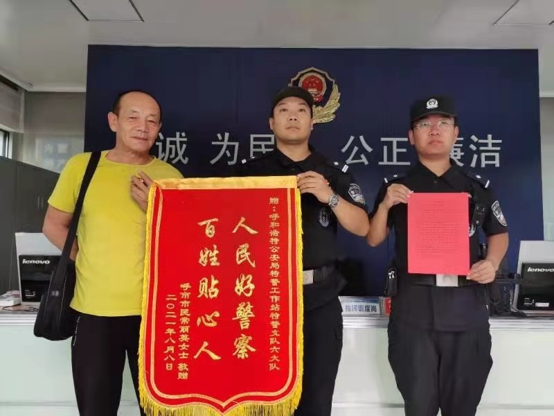 8月10日下午15時,常麗英丈夫郝青山來到六大隊回民警務(wù)站,送來了一面錦旗和一封感謝信,對大隊民警提供的熱心救助表示感謝。