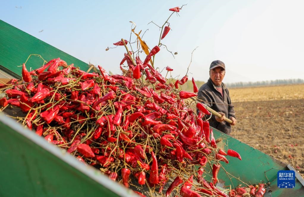 10月25日,在開魯縣東風(fēng)鎮(zhèn)東方紅村,村民收獲紅干椒。新華社記者 連振 攝