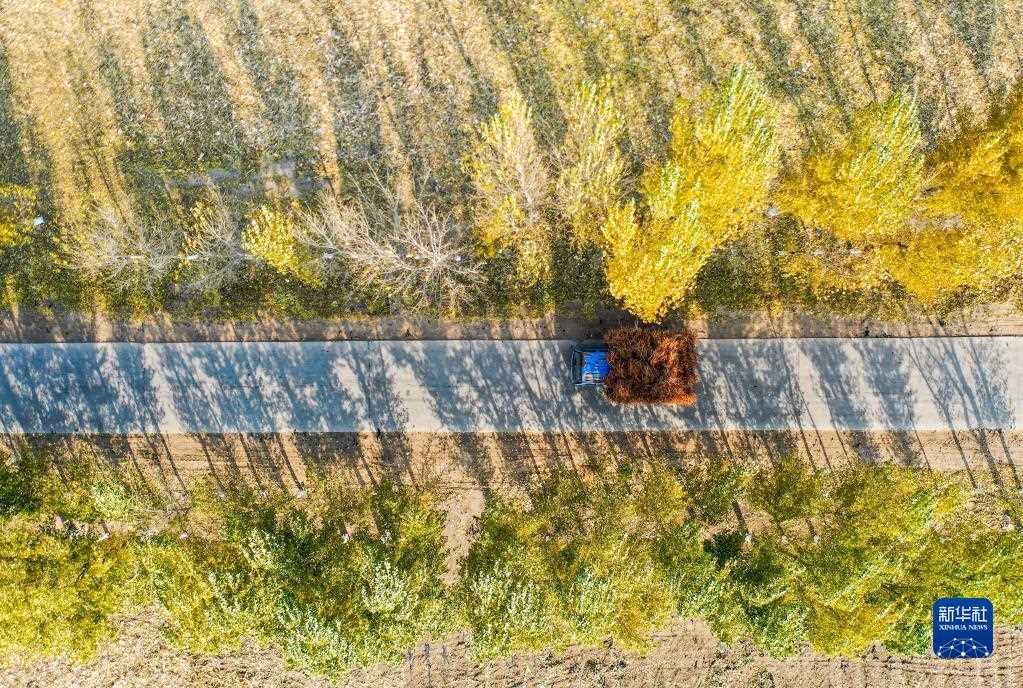 10月25日,在開魯縣東風(fēng)鎮(zhèn)東方紅村,村民運輸收獲的紅干椒(無人機照片)。新華社記者 連振 攝
