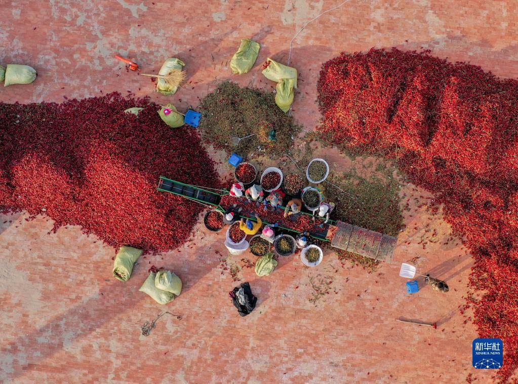 10月25日,在開魯縣東風(fēng)鎮(zhèn),工作人員分揀處理紅干椒(無人機照片)。新華社記者 連振 攝