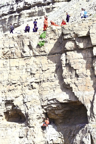 當(dāng)天7時左右,在烏海市海勃灣區(qū)甘德爾山景區(qū)半山腰處,攝影愛好者焦長青在拍攝時發(fā)現(xiàn)了一窩出生20多天的幼年野生黑鸛,其中一只黑鸛行動異常,疑似受傷。他立即撥打了119報警電話,同時聯(lián)系了烏海市野生動物保護部門。9時許,烏海市消防支援支隊光明路特勤站和烏海市野生動物保護部門的工作人員到達現(xiàn)場。經(jīng)勘查,在距離懸崖正下方大約30米處的巖洞內(nèi),一只幼年黑鸛被尼龍繩纏繞住腿部而受傷,不能行動。消防員隨后尋找合適的位置制作錨點。消防員陳意攜帶救援裝備速降到懸崖下方展開營救,一個小時之后,受傷的幼年黑鸛被成功救出,并送往海勃灣區(qū)林業(yè)草原局救助站進行救治。