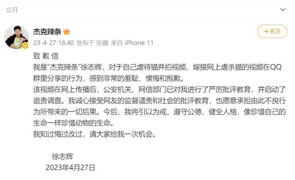 27日16時(shí)40分,@杰克辣條 在微博發(fā)表了署名“徐志輝”的致歉信稱,對(duì)于自己虐待貓并拍視頻、嫁接網(wǎng)上虐殺貓的視頻在QQ群里分享的行為,感到非常的羞恥、懊悔和抱歉。該視頻在網(wǎng)上傳播后,公安機(jī)關(guān)、網(wǎng)信部門已對(duì)其進(jìn)行了嚴(yán)厲批評(píng)教育,并啟動(dòng)了追責(zé)調(diào)查。