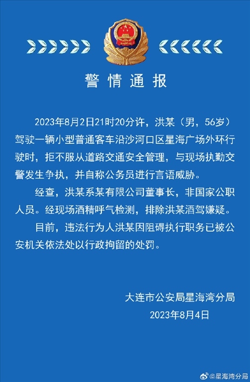 ·大連警方通報男子自稱公務員威脅交警:非公職人員,已行拘。