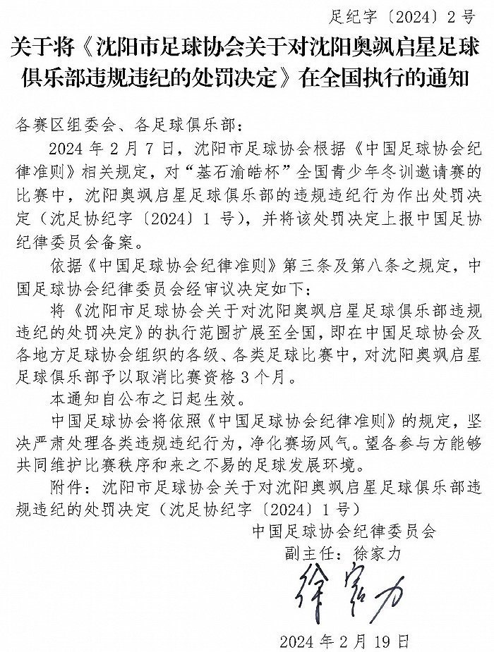 央視網消息:據(jù)中國足球協(xié)會2月21日發(fā)布通知,將《沈陽市足球協(xié)會關于對沈陽奧颯啟星足球俱樂部違規(guī)違紀的處罰決定》及《遼寧省足球運動協(xié)會關于對教練員吳高俊違規(guī)違紀的處罰決定》在全國執(zhí)行,具體內容如圖: