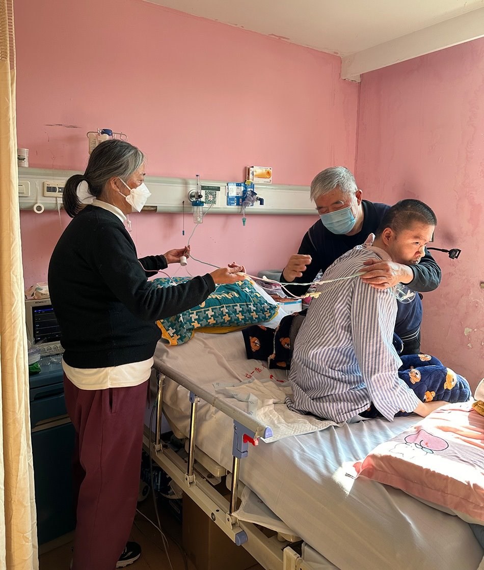 一月上旬的一個(gè)下午,鄭建英像過去一千多個(gè)日子一樣,坐在兒子床尾的椅子上,盯著他床頭監(jiān)視器的氧保。這幾年,她已經(jīng)形成條件反射,當(dāng)數(shù)值低于92時(shí),她會(huì)從椅子上彈起來幫他吸痰。