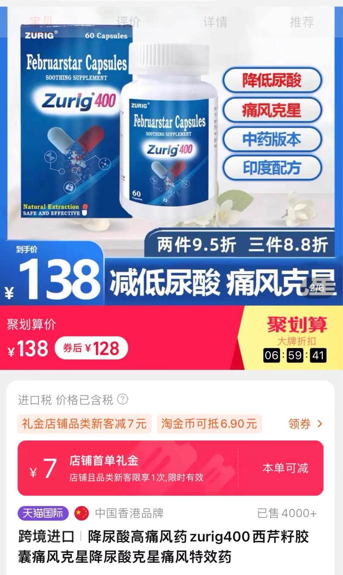 此外,zurig400在銷(xiāo)售頁(yè)面還模仿印度zurig80,宣稱(chēng)降尿酸、痛風(fēng)藥。澎湃新聞?dòng)浾哒{(diào)查發(fā)現(xiàn),zurig400目前在多個(gè)網(wǎng)購(gòu)平臺(tái)有售,有商家顯示已出售4000+。 經(jīng)了解后得知,印度zurig80實(shí)際上是一款仿制藥,目前國(guó)內(nèi)并未獲批上市;而zurig400卻是一款香港產(chǎn)的保健品類(lèi)目產(chǎn)品,并非藥品。但產(chǎn)品宣傳時(shí)卻使用“痛風(fēng)特效藥”“印度配方”“中藥非布”等詞語(yǔ),讓患者產(chǎn)生誤會(huì)。