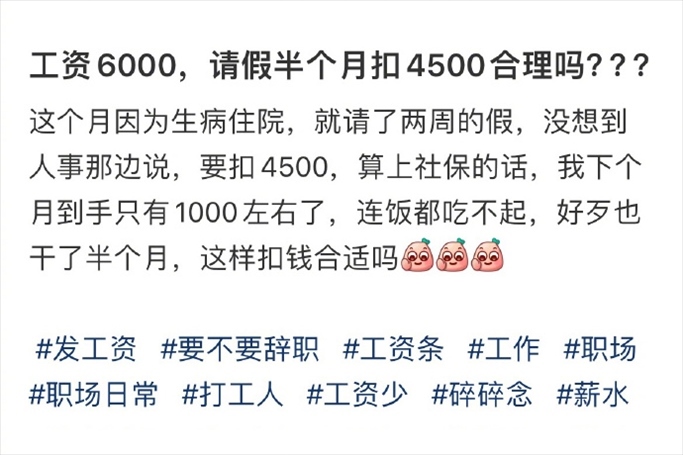 近日,#工資6000請假半個月被扣4500#的話題登上熱搜,引發(fā)關(guān)注。