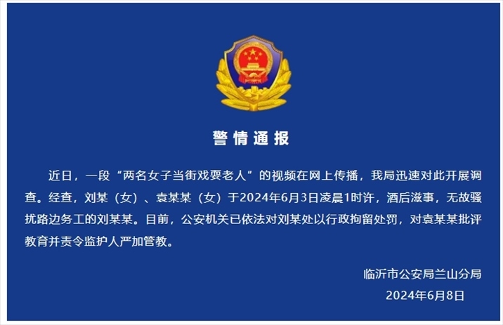 央視網(wǎng)消息:6月8日,臨沂蘭山公安發(fā)布警情通報(bào):近日,一段“兩名女子當(dāng)街戲耍老人”的視頻在網(wǎng)上傳播,我局迅速對(duì)此開(kāi)展調(diào)查。經(jīng)查,劉某(女)、袁某某(女)于2024年6月3日凌晨1時(shí)許,酒后滋事,無(wú)故騷擾路邊務(wù)工的劉某某。目前,公安機(jī)關(guān)已依法對(duì)劉某處以行政拘留處罰,對(duì)袁某某批評(píng)教育并責(zé)令監(jiān)護(hù)人嚴(yán)加管教。