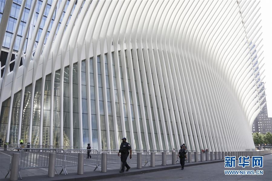 6月10日,警察在美國紐約世貿(mào)中心車站外戴著口罩巡邏。新華社記者王迎攝