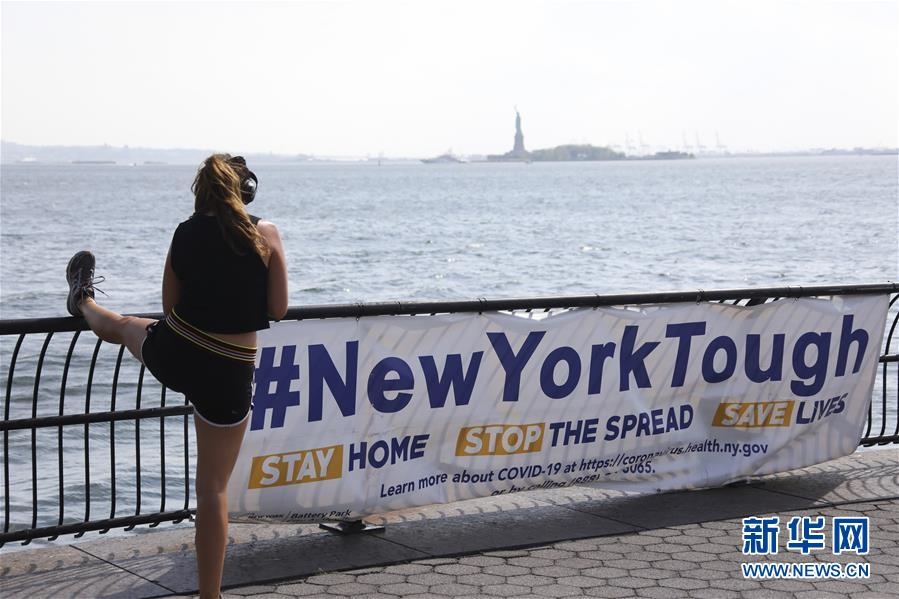 6月10日,一名女子在美國紐約一處公園內(nèi)寫有“紐約堅強”的橫幅旁鍛煉。新華社記者王迎攝