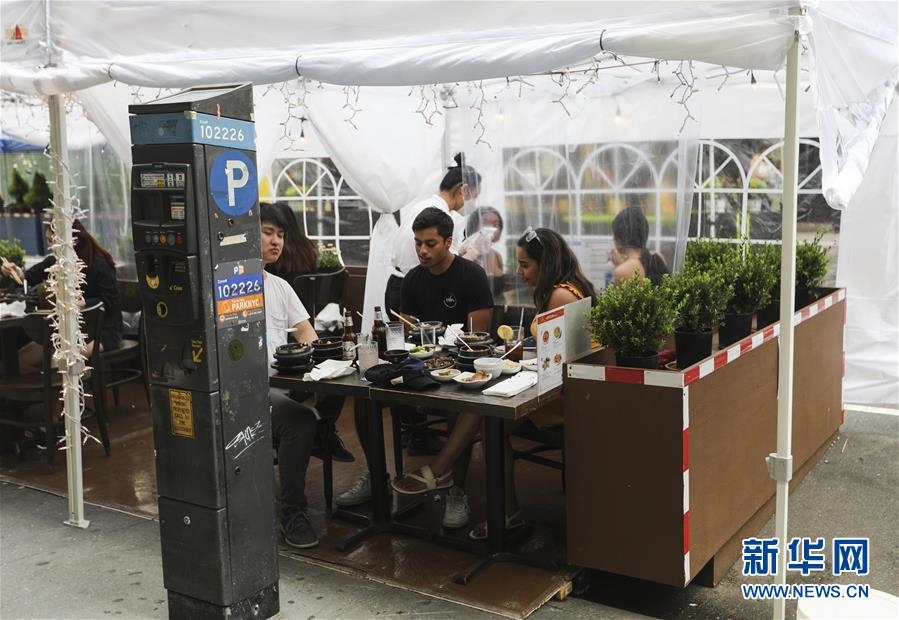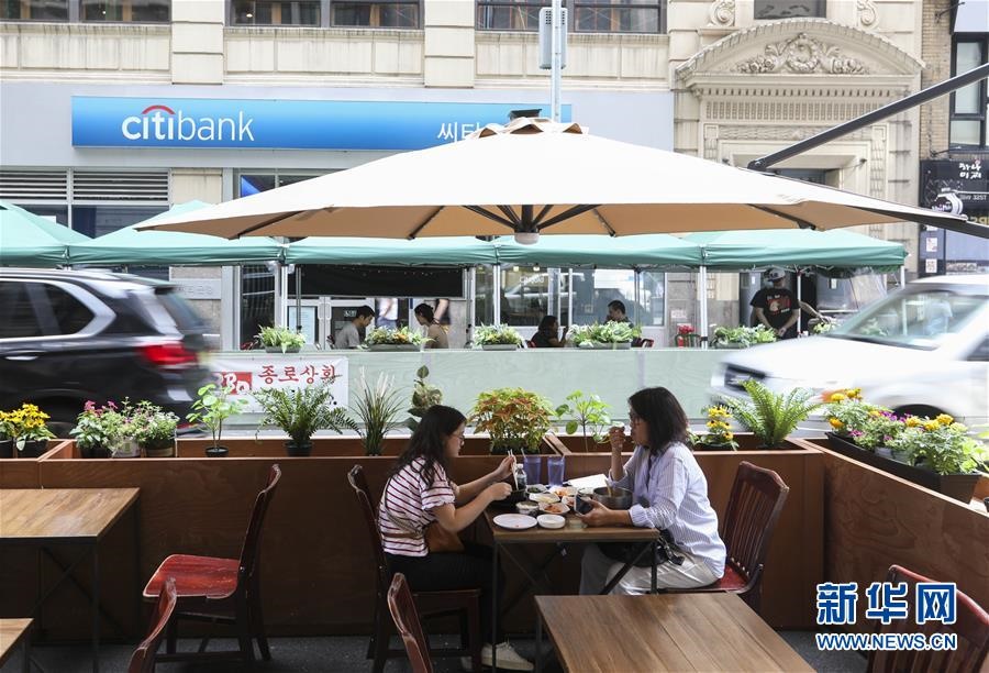 7月23日,在美國紐約,人們在戶外就餐區(qū)用餐。美國約翰斯·霍普金斯大學23日發(fā)布的新冠疫情最新統(tǒng)計數(shù)據(jù)顯示,美國累計確診病例超過400萬例。數(shù)據(jù)顯示,截至美國東部時間23日15時34分(北京時間24日3時34分),美國累計確診病例4007859例,累計死亡病例143846例。新華社記者王迎攝