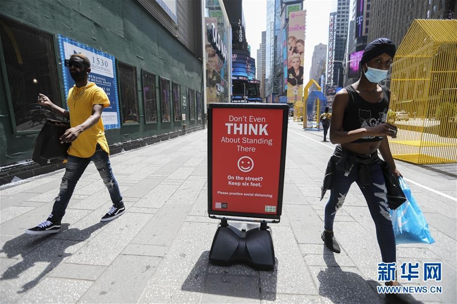 7月23日,在美國紐約時報廣場,人們從保持社交距離的提示牌旁走過。美國約翰斯·霍普金斯大學23日發(fā)布的新冠疫情最新統(tǒng)計數(shù)據(jù)顯示,美國累計確診病例超過400萬例。數(shù)據(jù)顯示,截至美國東部時間23日15時34分(北京時間24日3時34分),美國累計確診病例4007859例,累計死亡病例143846例。新華社記者王迎攝