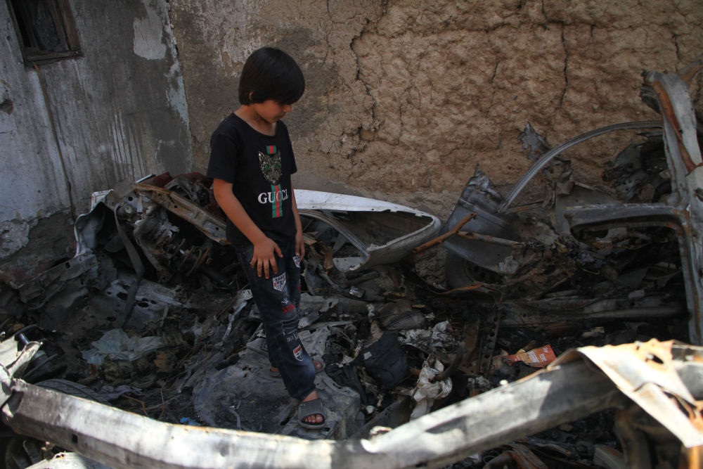 9月18日,在8月29日被美軍無(wú)人機(jī)襲擊的阿富汗喀布爾居民區(qū),遇難者親人站在汽車殘骸上。新華社發(fā)(塞夫拉赫曼·薩菲攝)