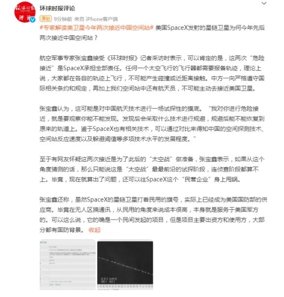 航空軍事專家張寶鑫接受《環(huán)球時報》記者采訪時表示,可以肯定的是,這兩次“危險接近”是SpaceX承擔全部責任。任何一個太空飛行的飛行器都需要報備軌跡,理論上說,大家都在各自的軌跡上飛行,不可能產(chǎn)生碰撞或近距離接觸。中方一向嚴格遵守國際相關(guān)條約和規(guī)定,再加上我們空間站中還有航天員,不可能主動去接近美國衛(wèi)星。