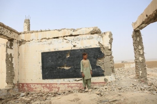 2022年8月23日,在阿富汗南部赫爾曼德省桑金地區(qū),一名男孩站在廢墟之中。桑金地區(qū)曾經(jīng)最繁華的市場(chǎng),如今遍布美軍空襲留下的一個(gè)個(gè)巨大彈坑。