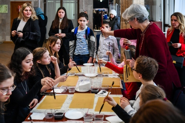 3月3日,在莫斯科國際關(guān)系學(xué)院,小朋友們在中國文化體驗活動上學(xué)習(xí)使用毛筆。新華社記者曹陽攝