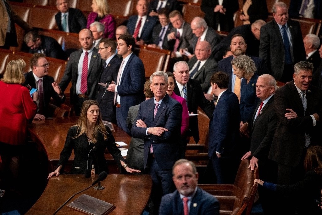 這是1月6日在美國華盛頓國會拍攝的凱文·麥卡錫(中)。經(jīng)過黨內(nèi)激烈爭論達成利益交換,共和黨眾議員凱文·麥卡錫于7日凌晨在第15輪眾議院議長選舉表決中當選議長。(新華社記者劉杰攝)