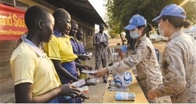 中國第九批赴南蘇丹(朱巴)維和步兵營長巡分隊官兵在丹蒙加拉為當?shù)貎和浰臀捏w用品。 中國赴南蘇丹(朱巴)維和步兵營供圖