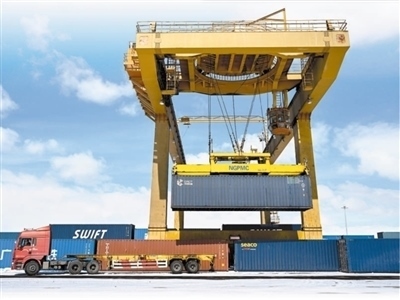 一輛貨車在滿洲里站貨運車間集裝箱場裝卸集裝箱。滿洲里口岸是中國最大的陸路口岸,也是中歐班列東通道進出境重要口岸。新華社記者 貝 赫攝