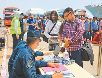 從蘇丹撤離的外籍人員在辦理登艦手續(xù)。 李怡諾攝(新華社發(fā))