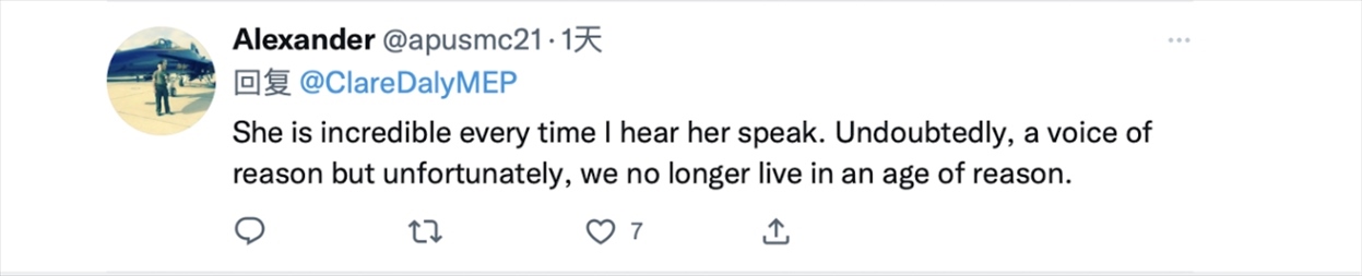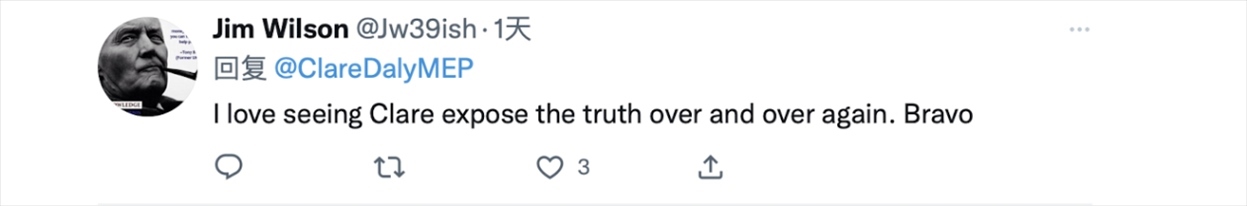 此前,克萊爾·戴利在接受環(huán)球時報記者采訪時,當(dāng)被問及在歐洲議會中是否會因為自身的對華立場而受到壓力,戴利稱,那或許不是一種“壓力”,而是一種反華的種族主義和陳舊的觀念作祟。愛爾蘭的媒體把我和我的同事米克·華萊士妖魔化了,因為我們發(fā)表的一些評論被中國媒體報道,他們就給我們貼上“專制政權(quán)傀儡”的標(biāo)簽。這種無知不能改變什么,所以我覺得不用擔(dān)心。我們的工作是利用歐洲議會這個平臺來代表歐洲公民的利益,而與中國保持良好關(guān)系符合歐洲公民的利益。