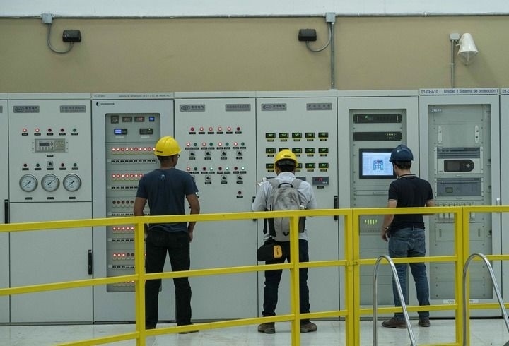 帕圖卡三水電站內(nèi),水電站工程技術(shù)部經(jīng)理張震在操作設(shè)備。(戴維·德拉帕斯攝)