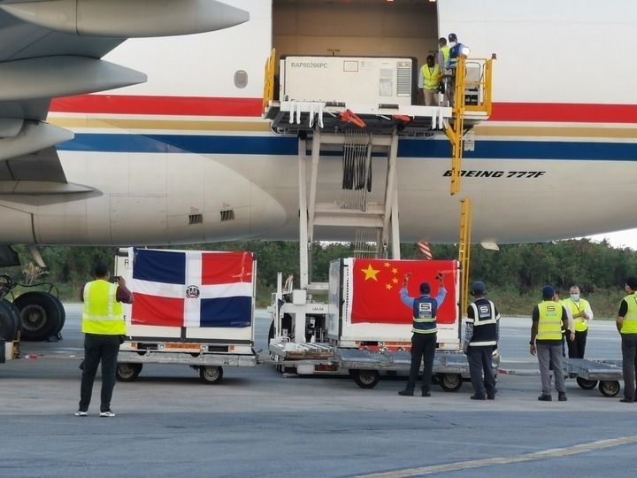 2021年3月17日,運(yùn)載中國(guó)新冠疫苗等物資的飛機(jī)抵達(dá)多米尼加首都圣多明各。新華社發(fā)(中國(guó)駐多米尼加大使館供圖)