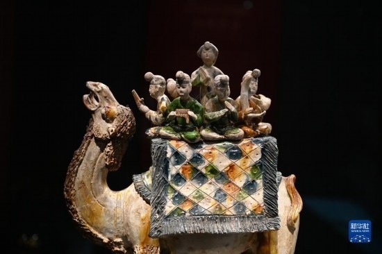 這是在陜西歷史博物館拍攝的唐三彩駱駝載樂俑(5月11日攝)。這件唐三彩駱駝載樂俑既是唐代文化藝術(shù)、制作工藝發(fā)達(dá)昌盛的重要物證,也見證了絲綢之路上藝術(shù)的交流與融合。