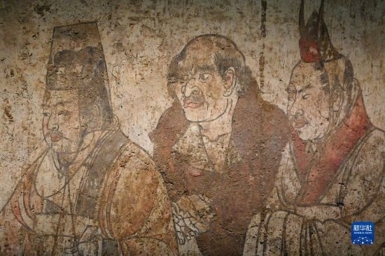 這是在陜西歷史博物館拍攝的唐章懷太子墓《客使圖》(局部)(5月11日攝)?!犊褪箞D》描繪的是唐代外交機(jī)構(gòu)鴻臚寺官員接待外國使節(jié)的場景。