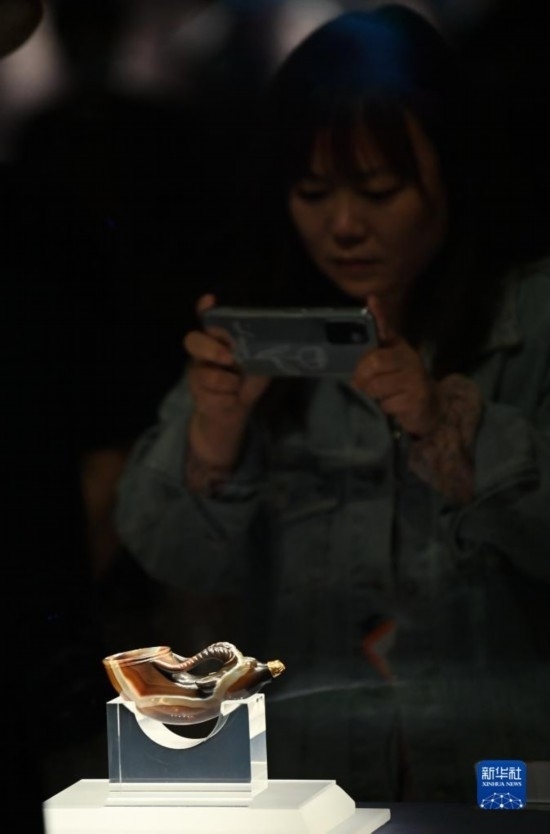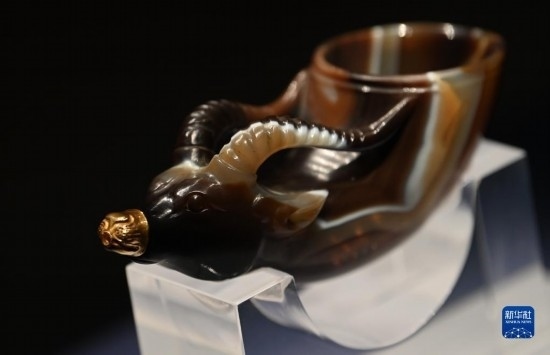 5月11日,游客在陜西歷史博物館參觀鑲金獸首瑪瑙杯。鑲金獸首瑪瑙杯的造型,與起源于古希臘的酒具“來通”相似,“來通”曾廣泛流行于中亞、西亞地區(qū),沿著絲綢之路不斷東傳進(jìn)入中國。