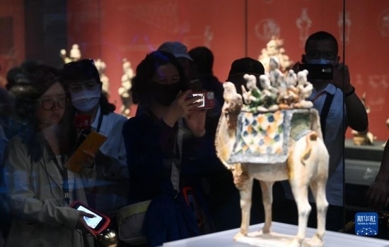 5月11日,游客在陜西歷史博物館參觀唐三彩駱駝載樂俑。這件唐三彩駱駝載樂俑既是唐代文化藝術(shù)、制作工藝發(fā)達(dá)昌盛的重要物證,也見證了絲綢之路上藝術(shù)的交流與融合。