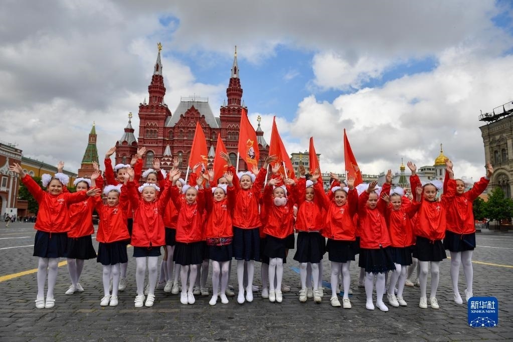 5月21日,在俄羅斯首都莫斯科,孩子們參加少先隊入隊儀式。當日,俄羅斯莫斯科舉行少先隊員入隊儀式,紀念少年先鋒隊成立101周年。   新華社發(fā)(亞歷山大攝)