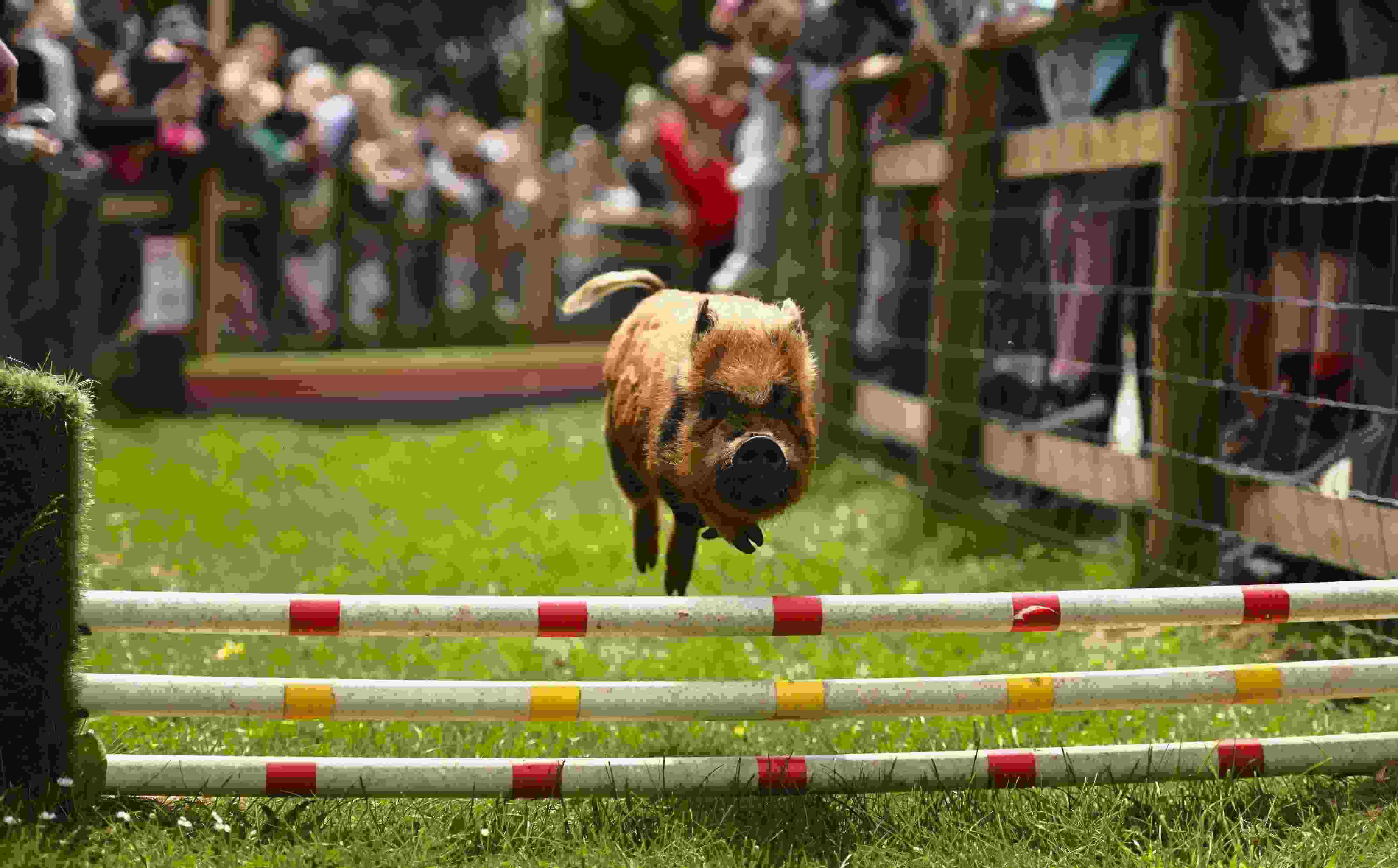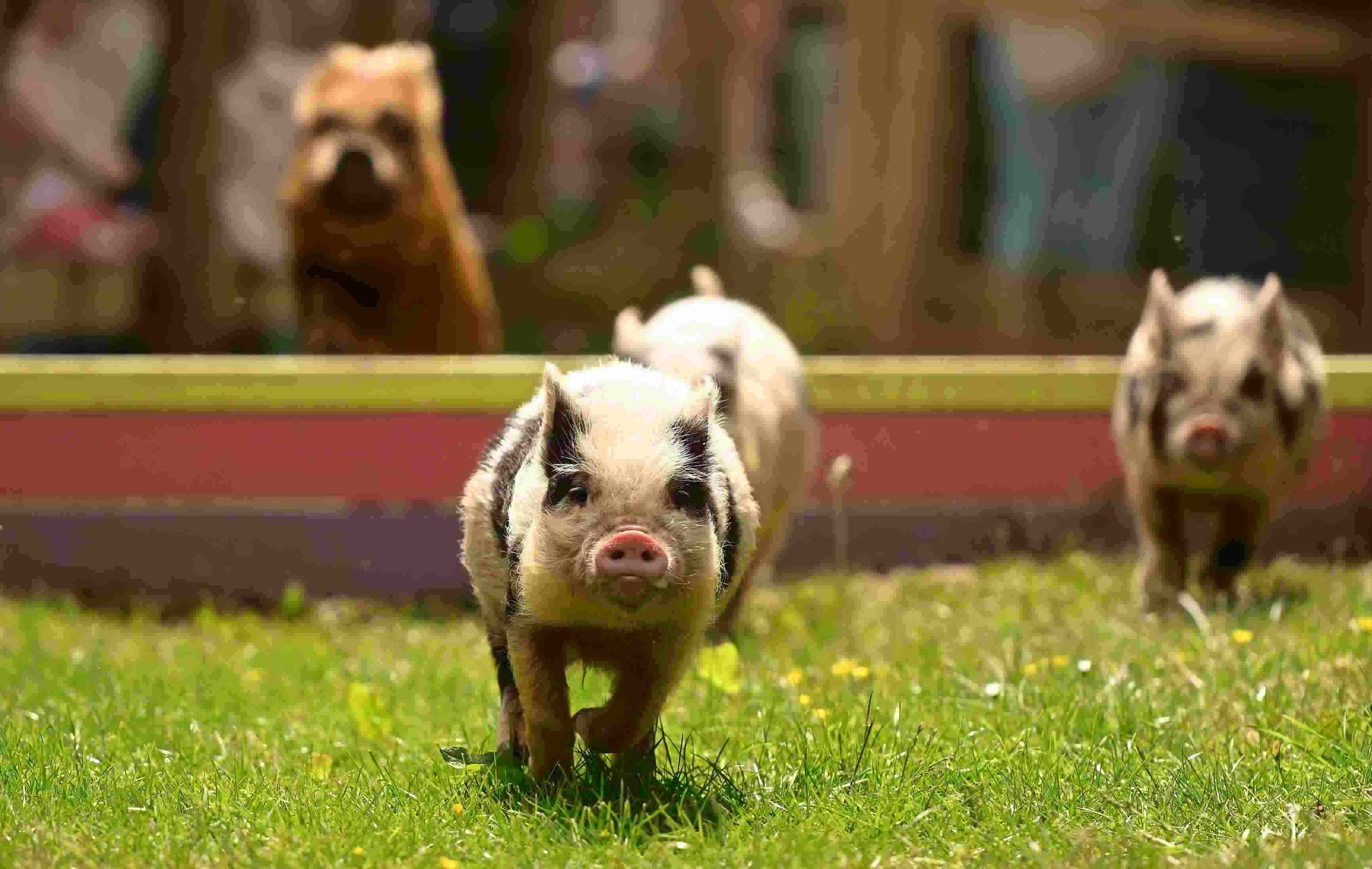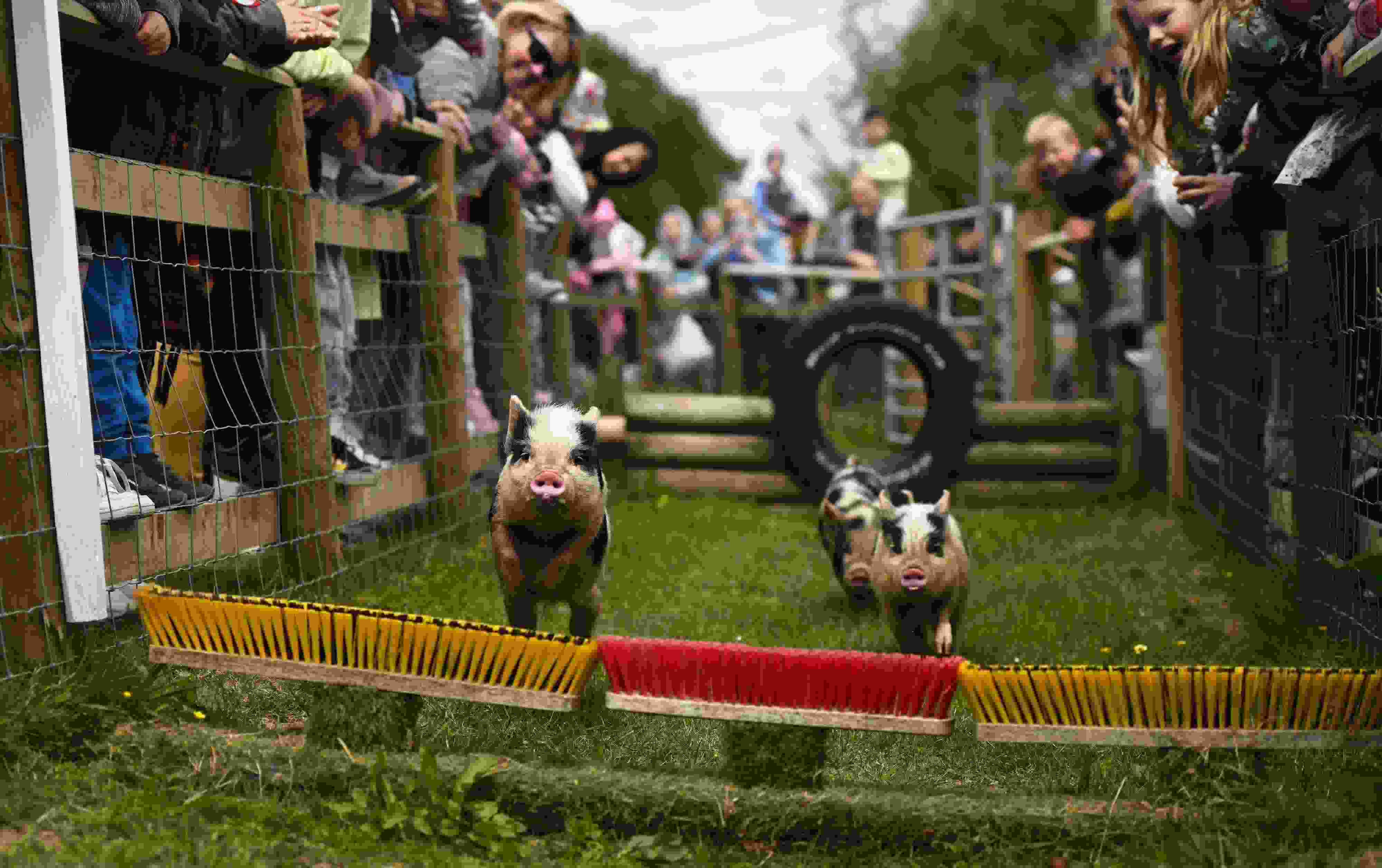 當?shù)貢r間2023年5月31日,英國戴文,當?shù)剞r(nóng)場舉行的小豬賽跑活動,小豬們在賽道上“你追我趕”。 視覺中國
