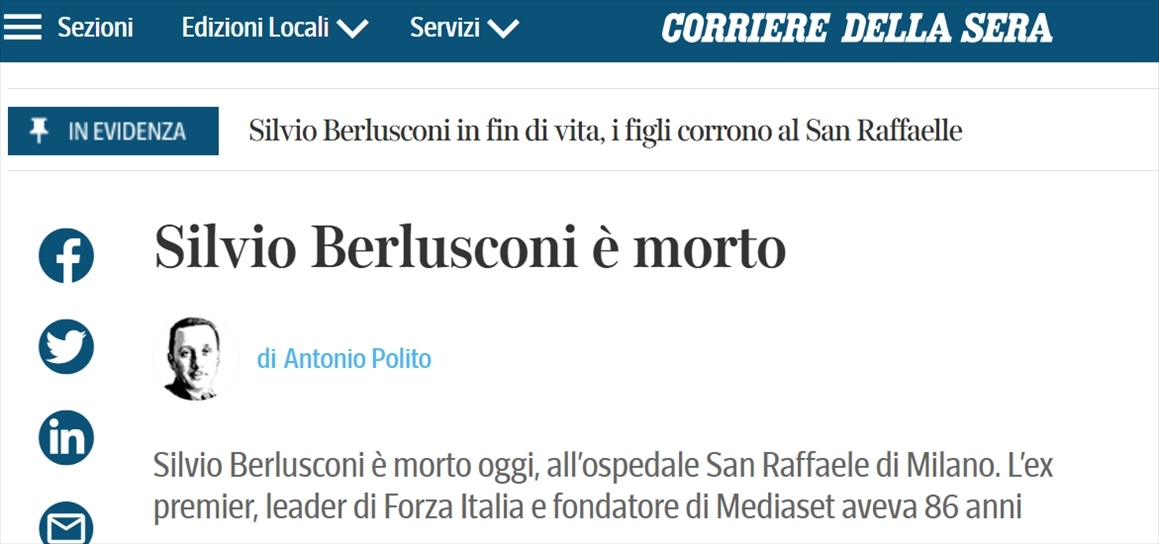 意大利媒體稱前總理貝盧斯科尼去世 其發(fā)言人證實