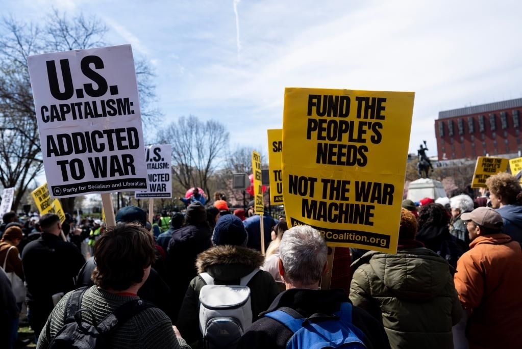 3月18日,在美國首都華盛頓,反戰(zhàn)人士在白宮前參加集會。新華社記者 劉杰 攝