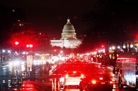 這是2022年12月22日在美國華盛頓拍攝的雨中的車輛和國會大廈。新華社記者 劉杰 攝
