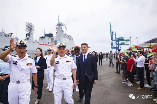 當(dāng)日上午9時(shí),懸掛著中加兩國(guó)國(guó)旗的編隊(duì)艦艇緩緩靠泊奧文多港碼頭,中國(guó)駐加蓬大使李津津及使館工作人員、當(dāng)?shù)刂匈Y機(jī)構(gòu)人員、華人華僑代表,加蓬國(guó)防部秘書長(zhǎng)彭吉中將及官兵代表等300余人位碼頭迎接。