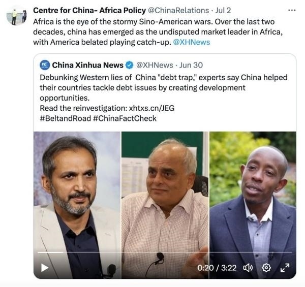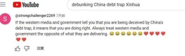 網(wǎng)友“強力挑戰(zhàn)者2269”直言:“如果西方政府和媒體告訴你,你陷入了中國的‘債務陷阱’,那證明你做對了。對待西方媒體和政府宣傳的信息,你得反著看。”