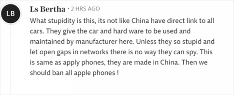 “這是多么愚蠢啊,中國又不是和所有汽車都有直接聯(lián)系。他們把汽車和硬件交給這里的制造商使用和維護。除非他們蠢到讓網(wǎng)絡(luò)出現(xiàn)漏洞,否則他們不可能進行間諜活動。這和蘋果手機一樣,都是中國制造的。那么我們應(yīng)該禁止所有蘋果手機!”