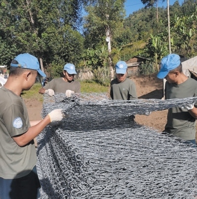 自去年9月部署到任務(wù)區(qū)以來,第二十六批維和工兵分隊(duì)已完成32項(xiàng)工程任務(wù)、26項(xiàng)工程勘察,累計(jì)修筑道路52公里、搭建板房50間、構(gòu)筑圍墻2100米。今年5月,南基伍省卡萊亥地區(qū)遭受強(qiáng)降雨和洪水災(zāi)害,造成400多人死亡,上千座民居被沖毀。關(guān)鍵運(yùn)輸線路上的魯濟(jì)拉橋被洪水沖垮,切斷了人道主義援助物資的運(yùn)輸線,給當(dāng)?shù)孛癖娊煌ǔ鲂泻涂购榫葹?zāi)造成嚴(yán)重影響。工兵分隊(duì)接到任務(wù)后,第一時(shí)間奔赴災(zāi)區(qū)一線,在河邊安營(yíng)扎寨,執(zhí)行工程救援。7月,嶄新的魯濟(jì)拉橋已經(jīng)順利完工。