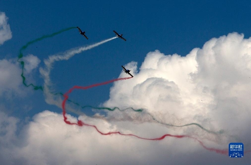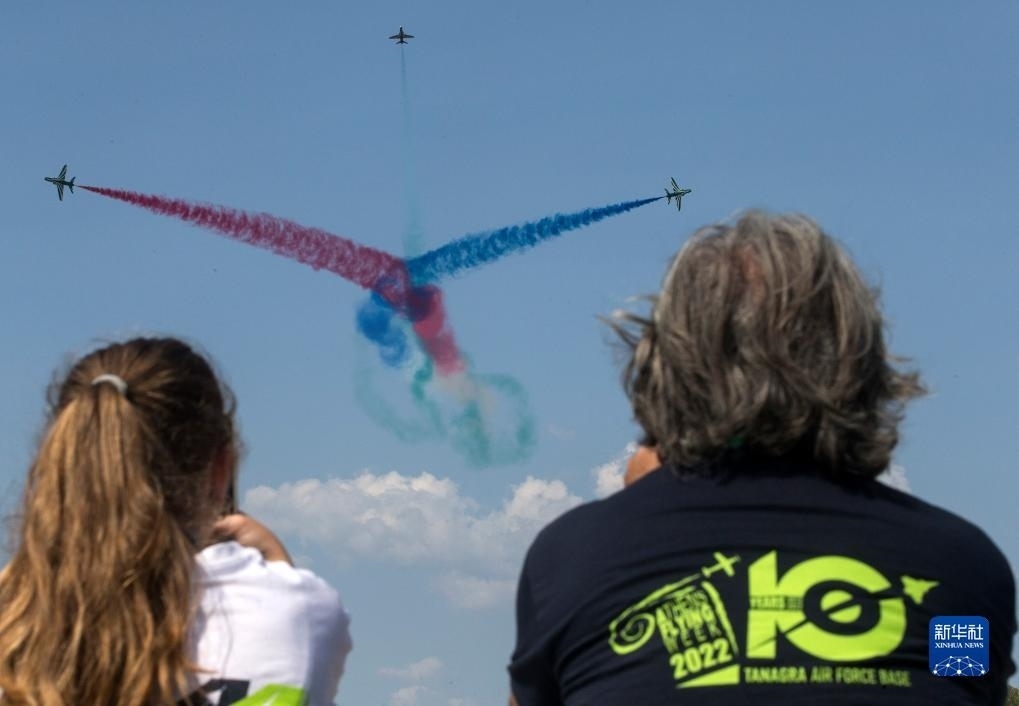 9月2日,在希臘塔納格拉空軍基地的雅典飛行周上,來自意大利的飛行表演隊(duì)進(jìn)行表演。新華社發(fā)(馬里奧斯·羅洛斯攝)