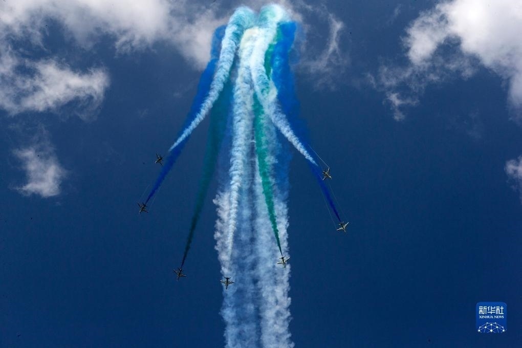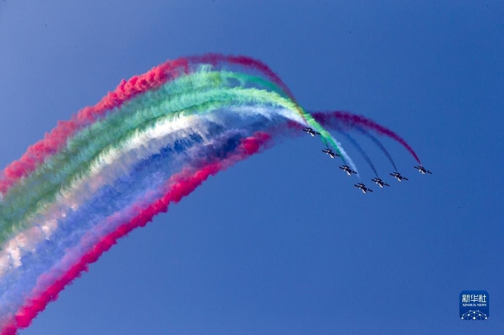 9月2日,在希臘塔納格拉空軍基地的雅典飛行周上,來自阿聯(lián)酋的飛行表演隊(duì)進(jìn)行表演。新華社發(fā)(馬里奧斯·羅洛斯攝)