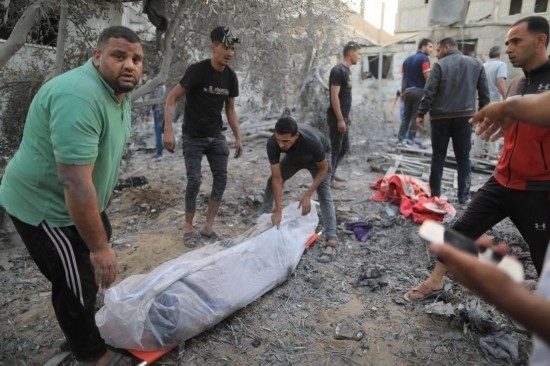 10月12日,在加沙地帶南部城市汗尤尼斯,人們?cè)谠庖陨锌找u后的建筑廢墟中抬出遇難者遺體。新華社發(fā)(亞西爾·庫迪攝)