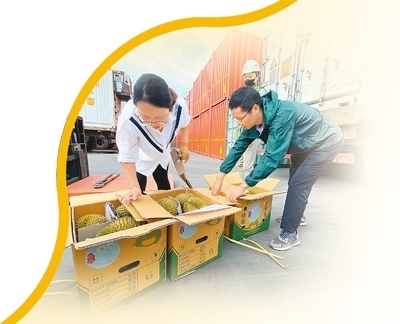核查貨證、抽樣開箱、剖果檢查……黃中磊和同事劉奇開始按流程查驗(yàn)?!皺z查病媒及有害生物,未見異常;檢查包裝,未見異常;核對(duì)品名,未見異常;檢查標(biāo)簽標(biāo)識(shí),未見異?!苯?jīng)過認(rèn)真查驗(yàn),兩人確認(rèn)這批榴蓮查驗(yàn)合格,可以出證放行。